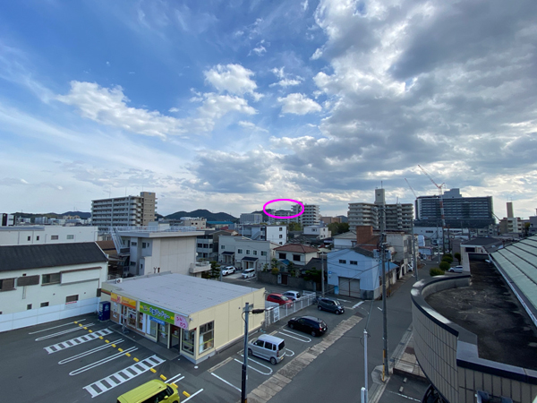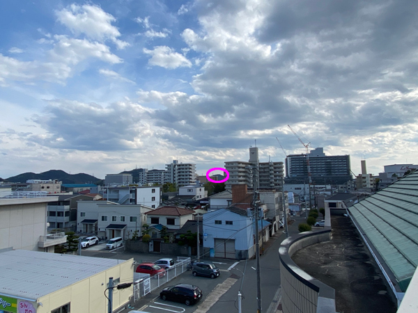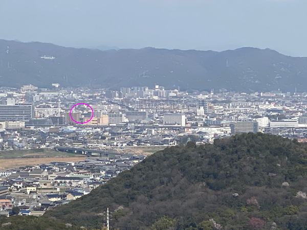 先ずは「御旅山」から見た家の方角ですが。山から見ると高いビルが邪魔して見えていないと思っておりましたが先日登った時は見えた訳で。