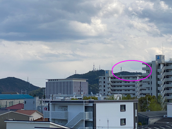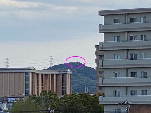 次に「仁寿山」からも見えたので逆から。同じようにビルの隙間から双眼鏡で望むと。