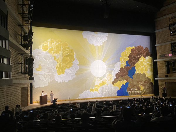 大ホールの緞帳ですが、賢三さんの寄贈されました。アクリエ姫路の開館は秋からですが。現在、関係者のみのイベントが次々に行われており。この写真は7月の初旬で行政・議員さん関係や姫路市全域の自治会長特別招待で開館式に参加した時の写真です。大ホールは賢三 展をみたついでに入る訳にはいきません。
