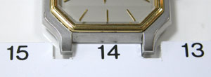 次に”ラグ幅”の確認ですが14mm。メンズのラグ幅は16〜18mmが普通ですから