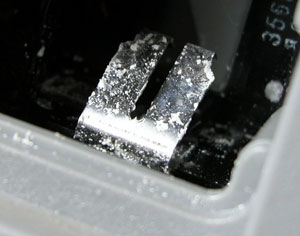 電池の端子がこうなります。綿棒などで拭いておきましょう。