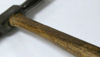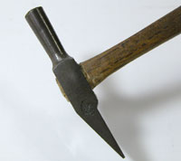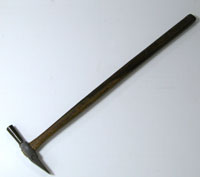 今でもこの形状の物は売っています。写真の物は父の代からの物で1960年頃の物です。もうアンティーク感すら出ていますが、最近はこれを使うことはなくなりました。もっとも腕時計の職人さんは今のハンマーよりもこちらの方を良く使用します。