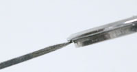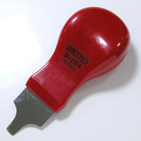 こじ開け工具も色々ありますが、違いは刃先の形状にあります。これはセイコーの専用こじ開け工具ですが”1個¥2.000”くらいですか。こじ開けとしては高いです。