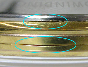 これが開け口ですが、これだけ拡大して分かるレベルですから肉眼ではわかりません。○の上が裏蓋の開け口。下はベゼルの開け口です。