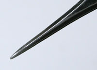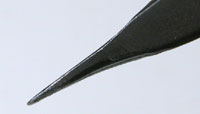 兎に角は先端が鋭利です。腕時計のピンセットとしては職人さんが”ヒゲゼンマイ修正用”に使うピンセットに似ています。これだけ先端が細いと腕時計の電池を摘んだりバネ棒をつまんだり、腕時計の部品として大きな物を掴むには不便です。もっともこれでも高い素材の良いピンセットなら使えなくもないのですが。