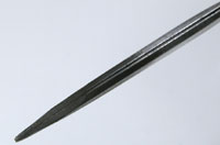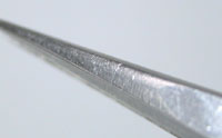 刃先も元は太かったのですが、自分で削って使っています。古いせいか、こんな物なのか。とにかくこのピンセットには弾力がまったくありません。ピンセットを握ると”ぐにゅぅ〜!”といった感じがありますが、これは”パコパコ!”といった感じ。よってこれはサビを削ったり力の掛かる作業で繊細さを必要としない作業に使います。