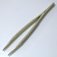 そしてこれはプラスチックのピンセット。よく電池交換作業の写真に出てくるピンセットです。プラスチックですから電流が導通しません。電池交換の時にピンセットでも指でも”プラスとマイナスを同時に触れてはいけない”というのはご存じと思います。それは電池が放電するからですが、プラスチックなら触って安心ですね。