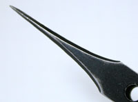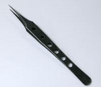 これが先の穴の空いたピンセット。これだけカーブが大きくては部品を”点で摘みます”。よって挟みにくい訳です。