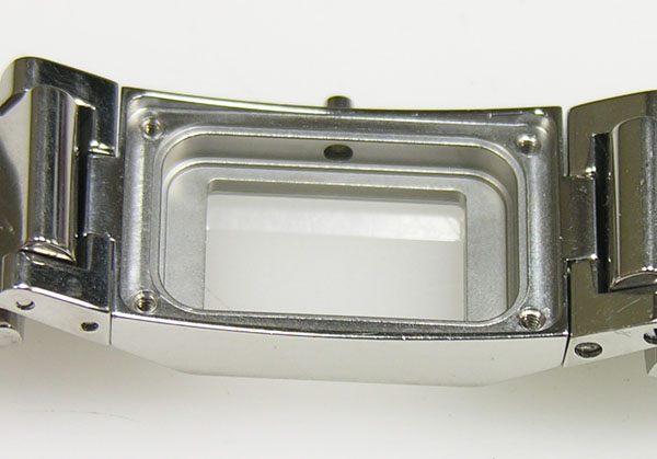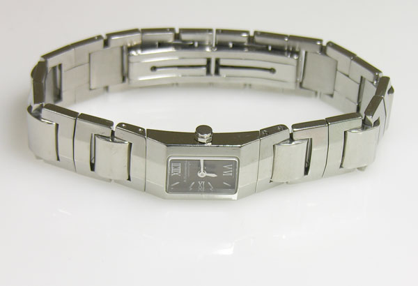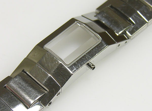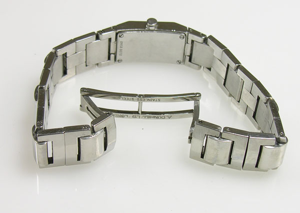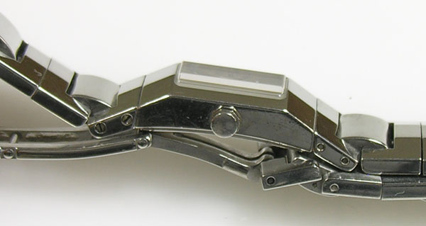 ステンレス無垢バンドに両開きバックル。