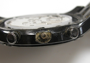 そのまえに、ムーブメントを戻して、プッシュボタンを差し込み機能するかテストしてみますが、やはり詰まっているのか押し込んでもプッシュボタンが効いておりません。