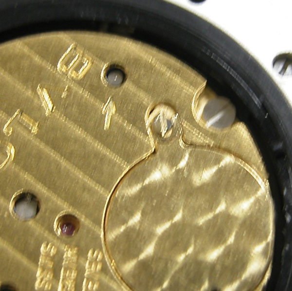 これがムーブメントで。電池蓋があるタイプですがこの後、この電池蓋を閉める為にネジを回すと金色の固定ネジの頭が半分欠けました。