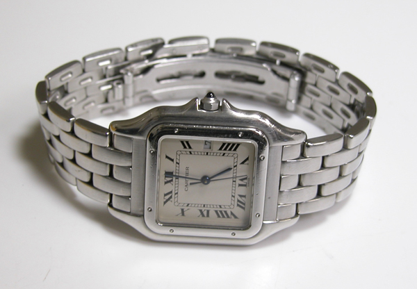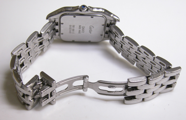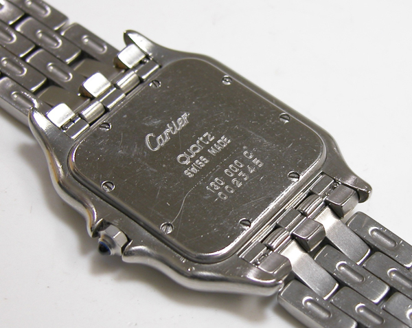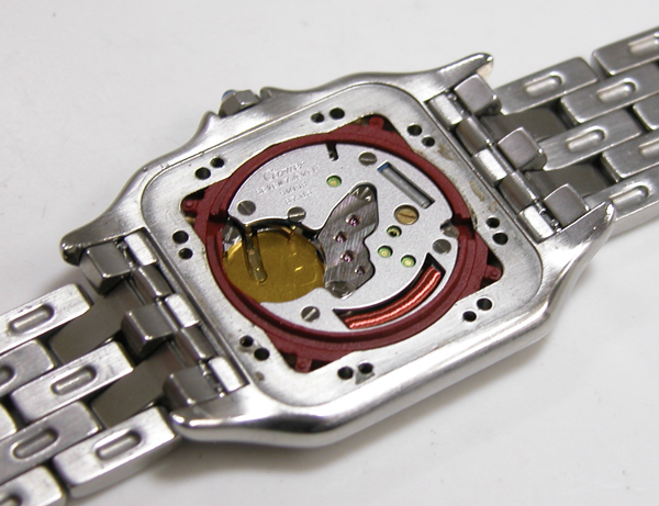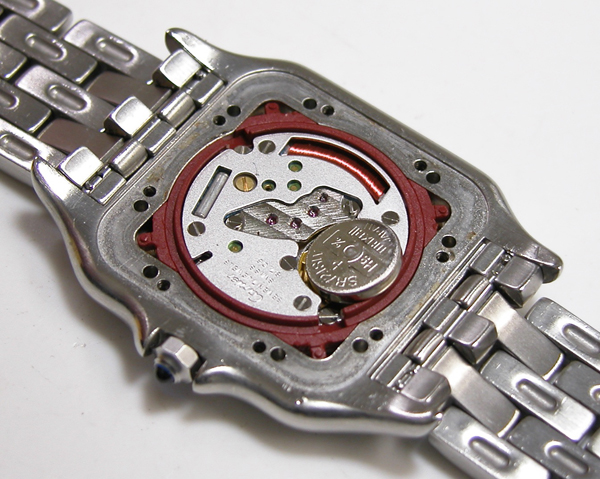 Cartier Pantere7 電池交換 電池交換・修理 2026.03.26 2022.11.6お預かりのCartier Pantere 電池交換です。2020年にもお預かりの腕時計。 竜頭の動きをチェックして。 ステンレス無垢バンドに両開きバックル。 裏蓋は8本ネジで留まっていて裏蓋記載。 これがムーブメントで。 ムーブメント拡大。 ケースの汚れを拭き取り電池格納部をチェックします。電池を入れて動作確認。 時間を合わせて電池交換完了です。 mr-coo.com/battery/brand-maintenance/cartier/pantere7