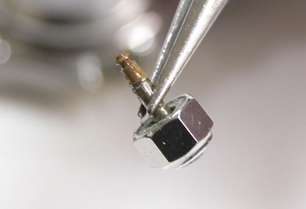 錆びて折れた訳ですが、この部分が錆びているようではムーブメントの中央は錆で真っ茶になっているでしょう。分解修理不可の状態で「ムーブメント交換」レベルです。ムーブメント取り出しで確認も考えましたが文字盤に負荷が掛かり剥がれても困りますから止めておきます。