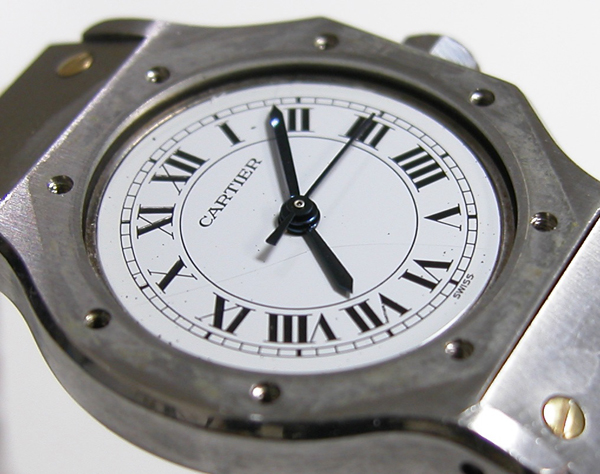 2023.3.5お預かりのCartier Santos BARBE 電池交換です。ガラスにヒビがある様に見えますが文字盤の塗装にヒビが入っております。内部に湿気が入り日光に当たるとよくこうなります。