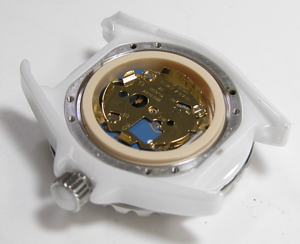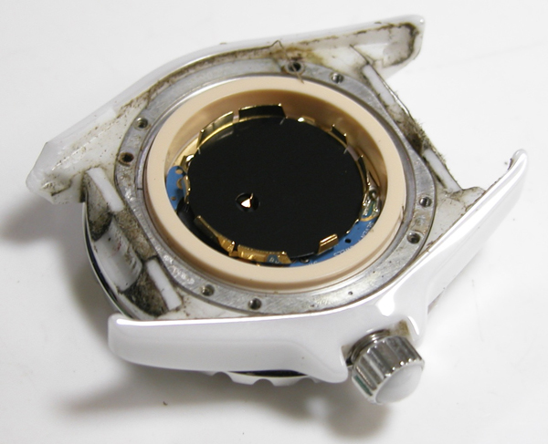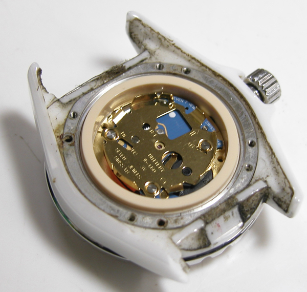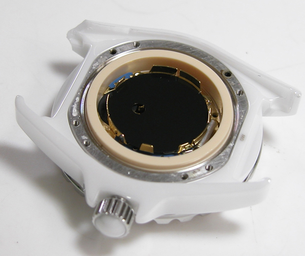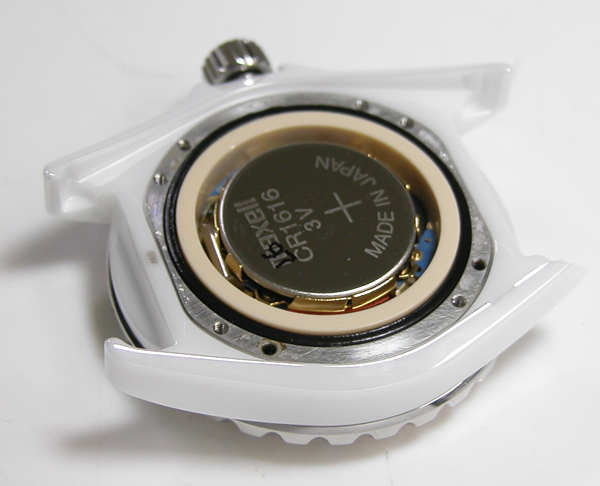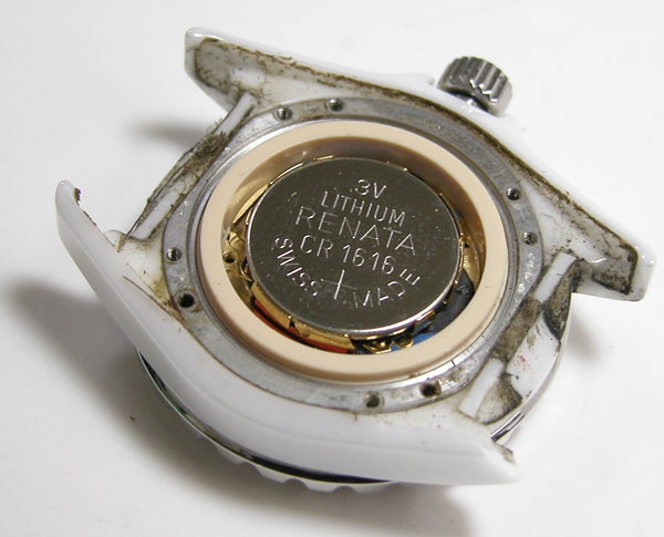 裏蓋を開けると電池がムーブメントを覆っています。