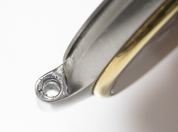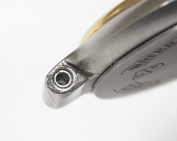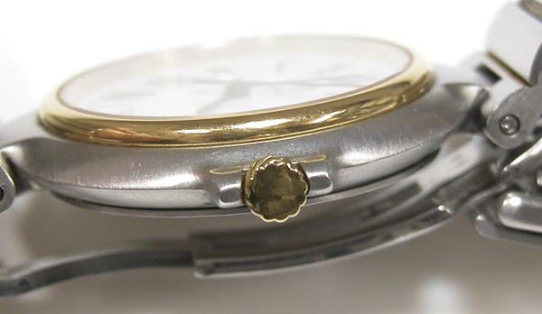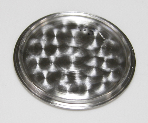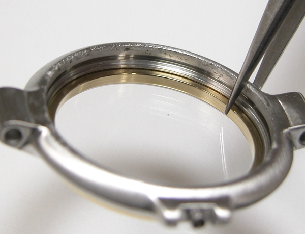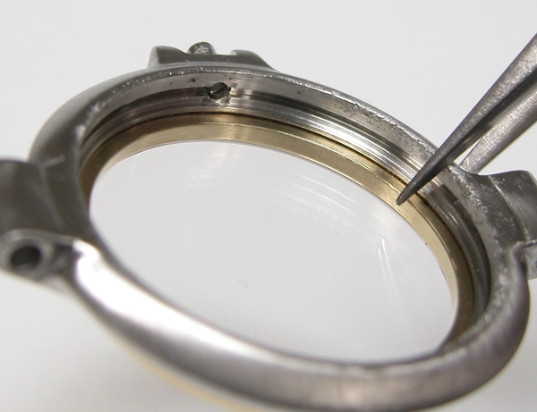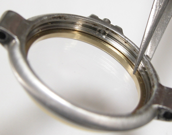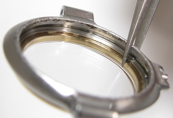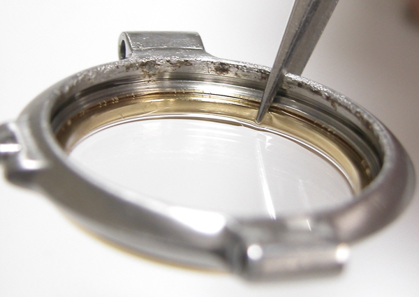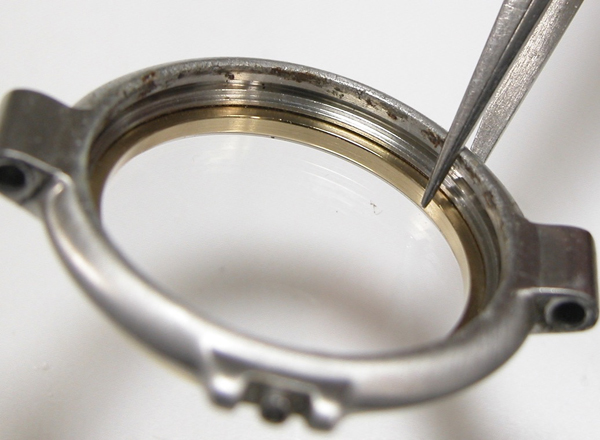 イマイチ綺麗にはならず。反対側もチェックしますが同じ状態。これは削り落とすしかありません。ただこのモデル裏蓋の圧着が弱く防水機能は弱いので余り削ると「圧着が益々、弱くなるので軽くしか削れません」。