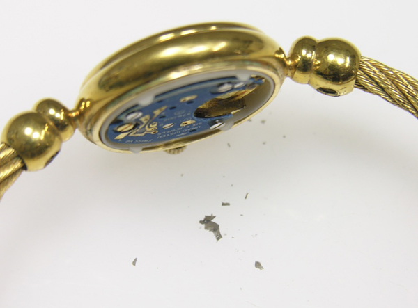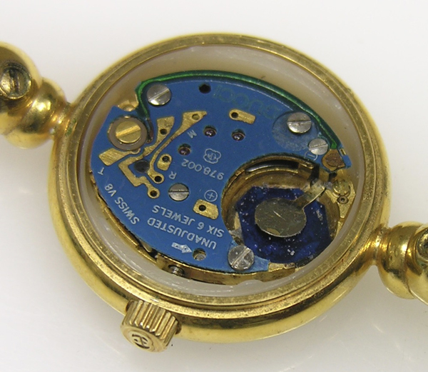 しかし不動ですから液漏れの粉がムーブメントに回っており「要・分解修理」ですから30.000円以上ははかかります。