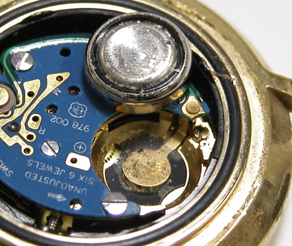 電池を外して見ると液漏れがひどい。吹いた粉が歯車にまで及んでおります。念のために電池交換してみますが不動です。「要・分解修理」となりますが、ムーブメント交換の方が早い感じですが数万円を掛けてまで直す方は居ません。