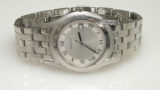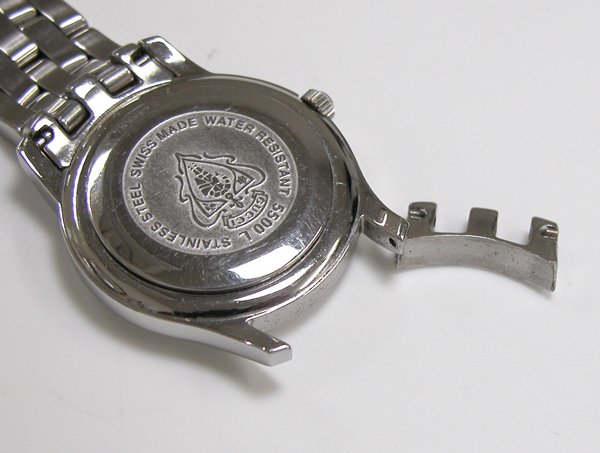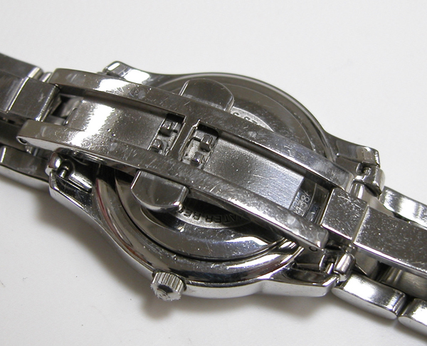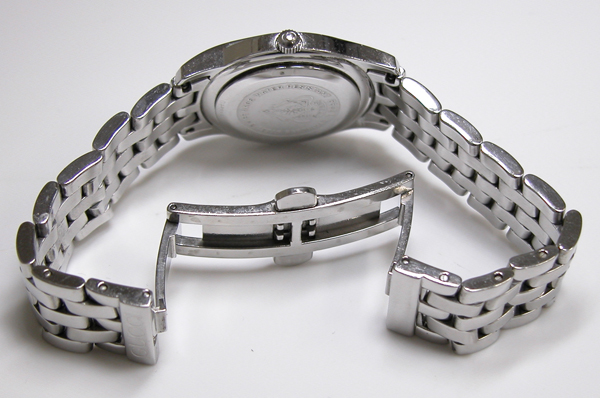 ステンレス無垢バンドに両開きバックル。