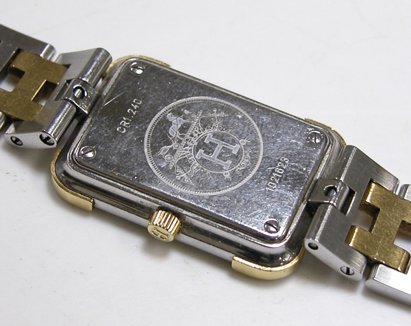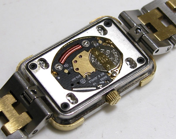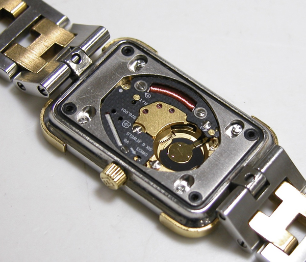 HERMES Clipper CR1.240 電池交換 ブランド・ウォッチ 2026.04.14 2023.9.10お預かりのHERMES Clipper CR1.240 電池交換です。 ステンレス無垢バンドに三つ折れバックル。 裏蓋は4本ネジで留まっていて裏蓋記載。 裏蓋の裏側もチェックしますが異常は無く。 これがムーブメントで。 ムーブメント拡大。 ケースの汚れを拭き取り電池格納部をチェックします。 電池を入れて動作確認。時間を合わせて電池交換完了です。 mr-coo.com/battery/brand-maintenance/hermes/clipper-cr1-240