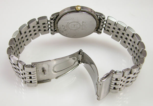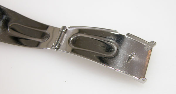 ステンレス無垢バンドに三つ折れプッシュバックル。