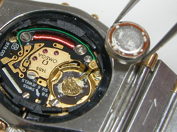 綺麗になったケースにムーブメントを戻して電池格納部をチェックしまが「液漏れ」状態。