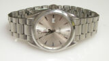 ステンレス無垢バンドに三つ折れプッシュバックル。