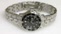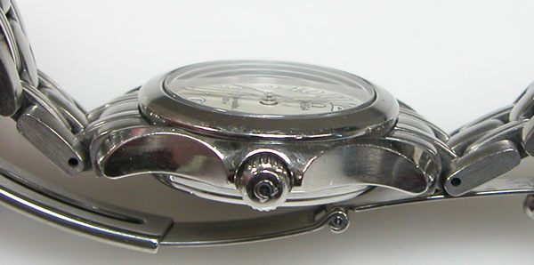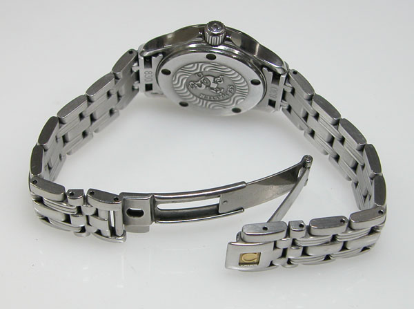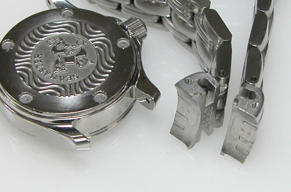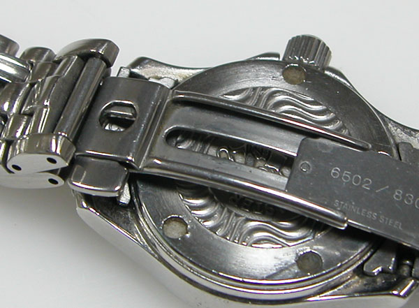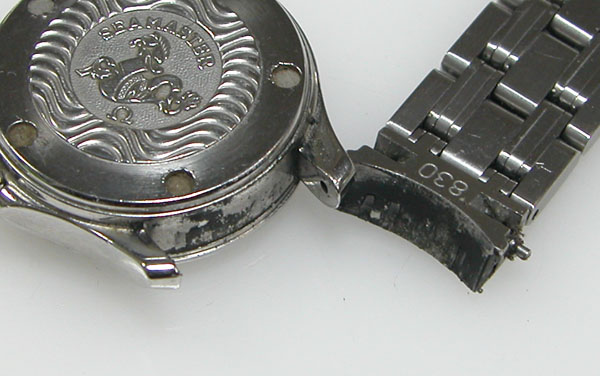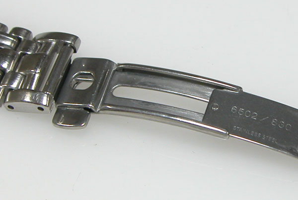 ステンレス無垢バンドに三つ折れプッシュバックル。綺麗に見えますが2年分の汚れがコマの隙間に見えます。