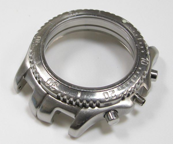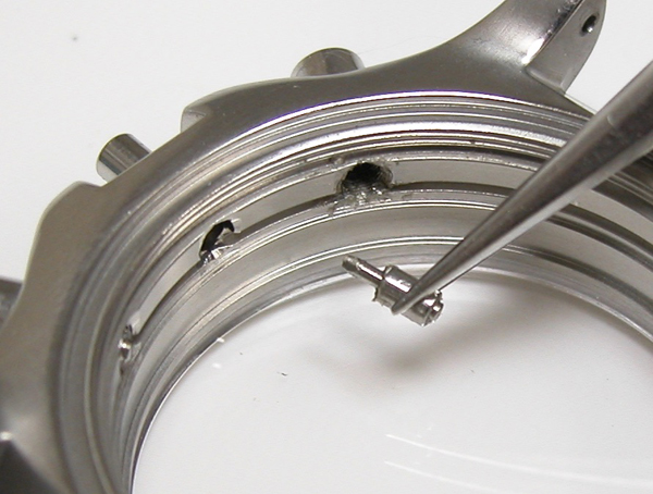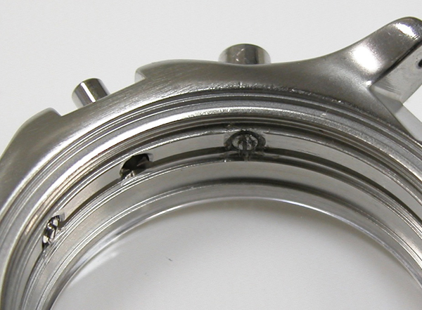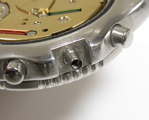 異常は無いようですが、時計専用のコーキングでも無く(時計にコーキングという修理は存在しませんが)。再度、コーキングのし直しでプッシュボタンを外します。