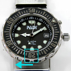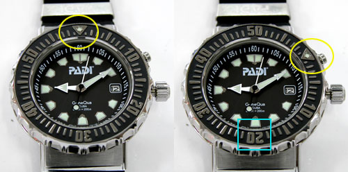 ベゼルの▽マーク(数字でいう12時)を写真・右の様に長針の先に移動します。