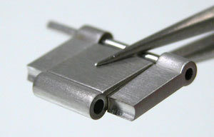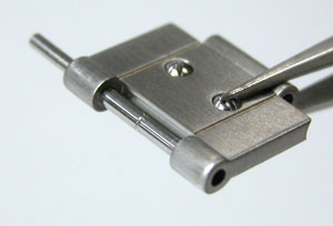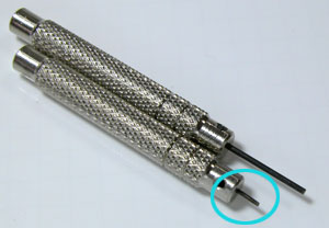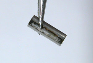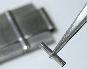 渾身の力で叩いたので、この部分が壊れてしまった(;^_^Aまぁ、どうせ壊れたコマですから良しとしますか。余りコマからピンを固定するパイプを抜き取ります。(Cリング式の”Cリング”みたいなものですか)