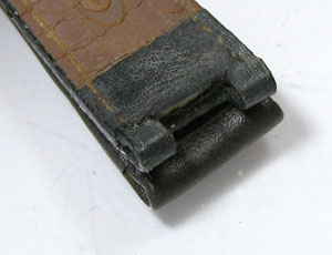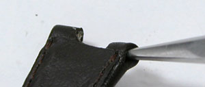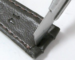 新品のベルトはピンが通る穴がふさがり気味になりますからピンセットで穴を大きくします。写真・右の位置まで縫うようにピンを通したあとは。