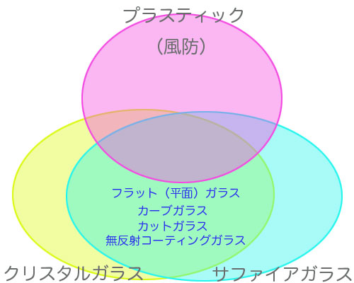 「平ガラス」「カーブガラス」「厚み」「サファイアガラス」「コーティング」で決まります。