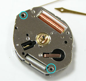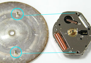 文字盤の「足」がムーブメントに固定されます。分かりやすいように表を向けます。