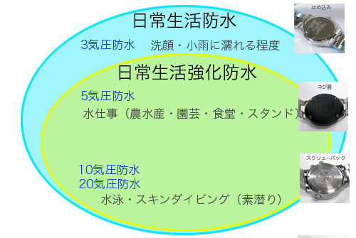 一般的な(気圧防水)のみで潜水用(××m防水)もカット。