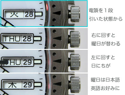 まず「1段引いた状態」で竜頭を”右に回すと曜日”が変わります。