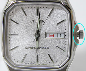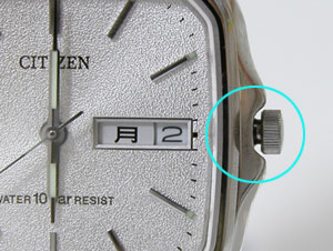 上の写真では竜頭が”2段引き状態”(針回し状態)ですから
