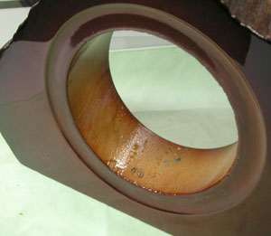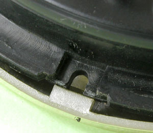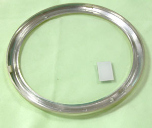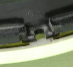 ちょっとピンボケましたが、この様に外します。他の2カ所。全部で3カ所の爪を外せば。 金色(表から見れば)の枠とガラスが外れます。「年輪置き時計修理」続き