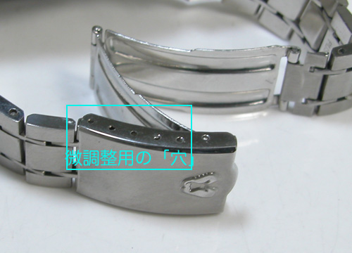 先ずバックルを開くのに指を掛ける方の穴は触れない事が原則。左側5つの穴で調整します。