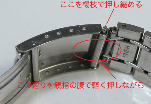 親指を○の辺りに添えてバックル内側に向かって押す力を加えながら、