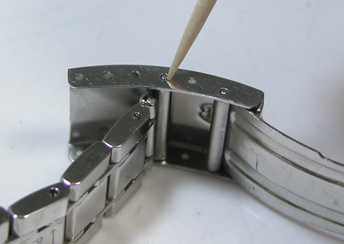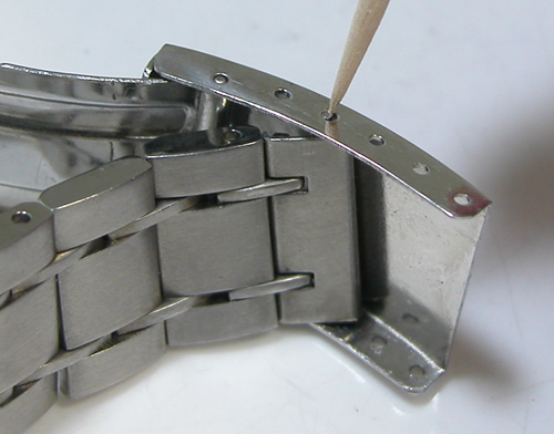 バックル左指で固定し右手で爪楊枝を持ってバネ棒の先端を突きます。