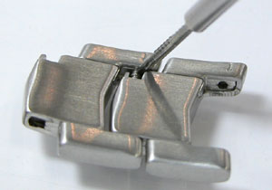 カシオ独自の調整方法(バネ棒アジャスト) ベルト調整・交換 2026.03.07 004年7月(記述) バネ棒はラグ部(ベルト取り付け部)に使用されるものです。そのバネ棒がベルトのピンとして使用されたモデルの紹介です。ベルトのコマの写真のみとなりますが解説です。 拡大すればバネ棒が入っている事がわかります。 ドライバーを差し込んで、バネ棒を外す要領で外します。 ラグ部のバネ棒と少し形状が違おります。まずは「その他の調整方法/カット式」から。2017.7.1修正 旧:casio-banebou.html